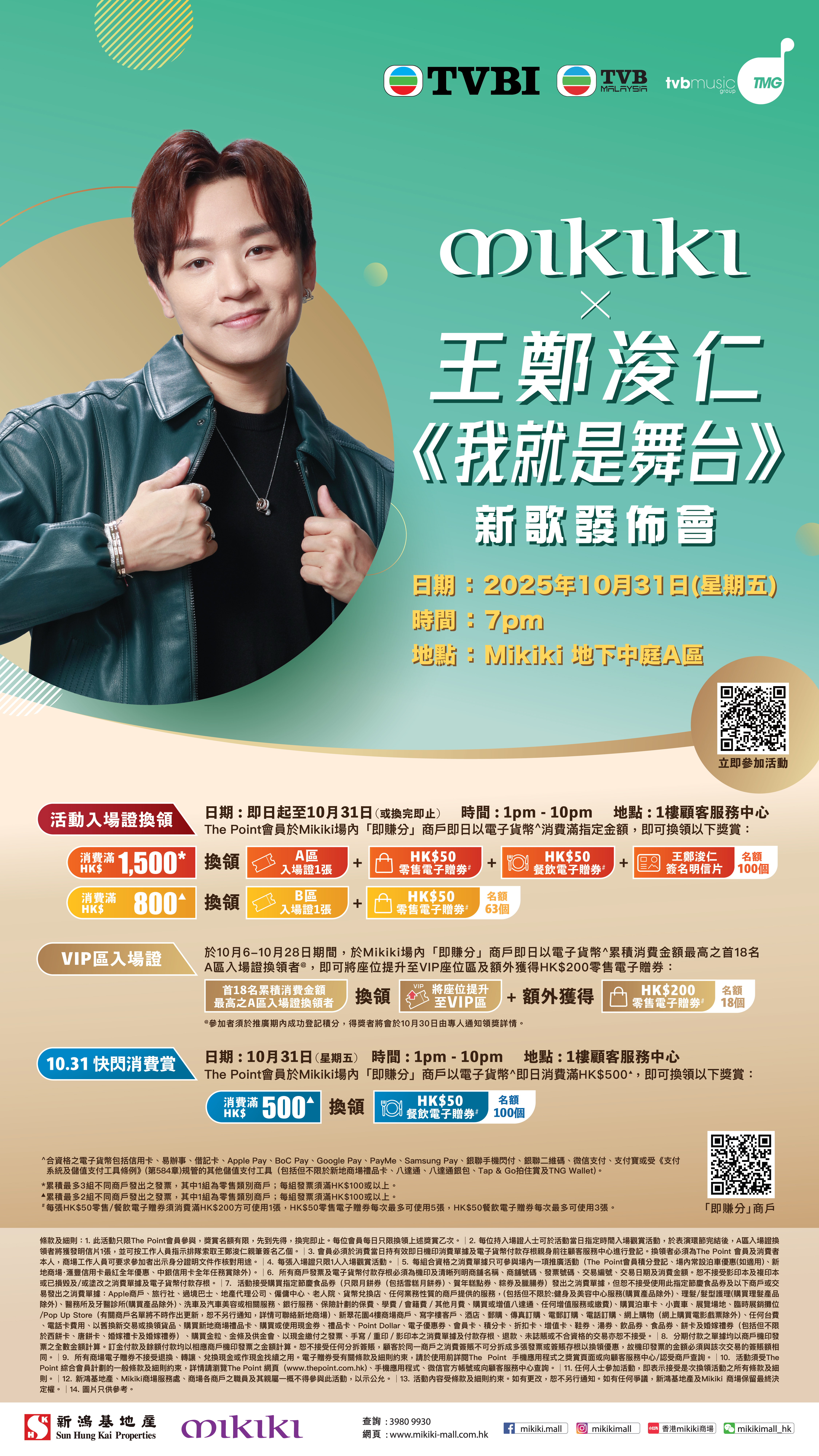 A區入場證換領:The Point 會員於場內「即賺分」商戶即日以電子貨幣消費滿HK$1,500*,即可換領A區入​​場證1張 + HK$50零售電子贈券# + HK$50餐飲電子贈券# + 王鄭浚仁簽名明信片 (名額:100個)
