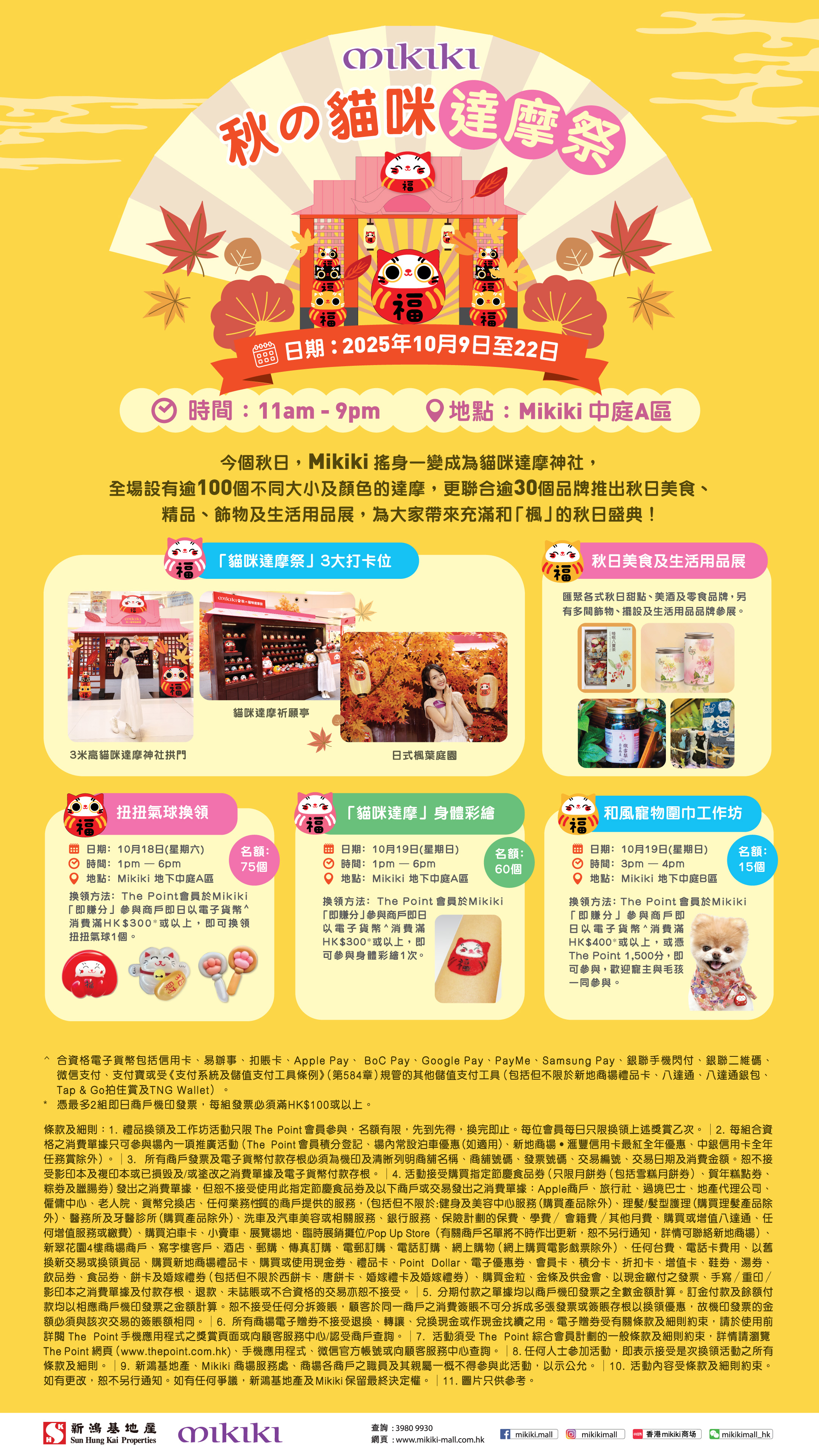 今個秋日,Mikiki搖身一變成為貓咪達摩神社,全場設有逾100個不同大小及顏色的達摩,更聯合逾30個品牌推出秋日美食、精品、飾物及生活用品展,為大家帶來充滿和「楓」的秋日盛典!