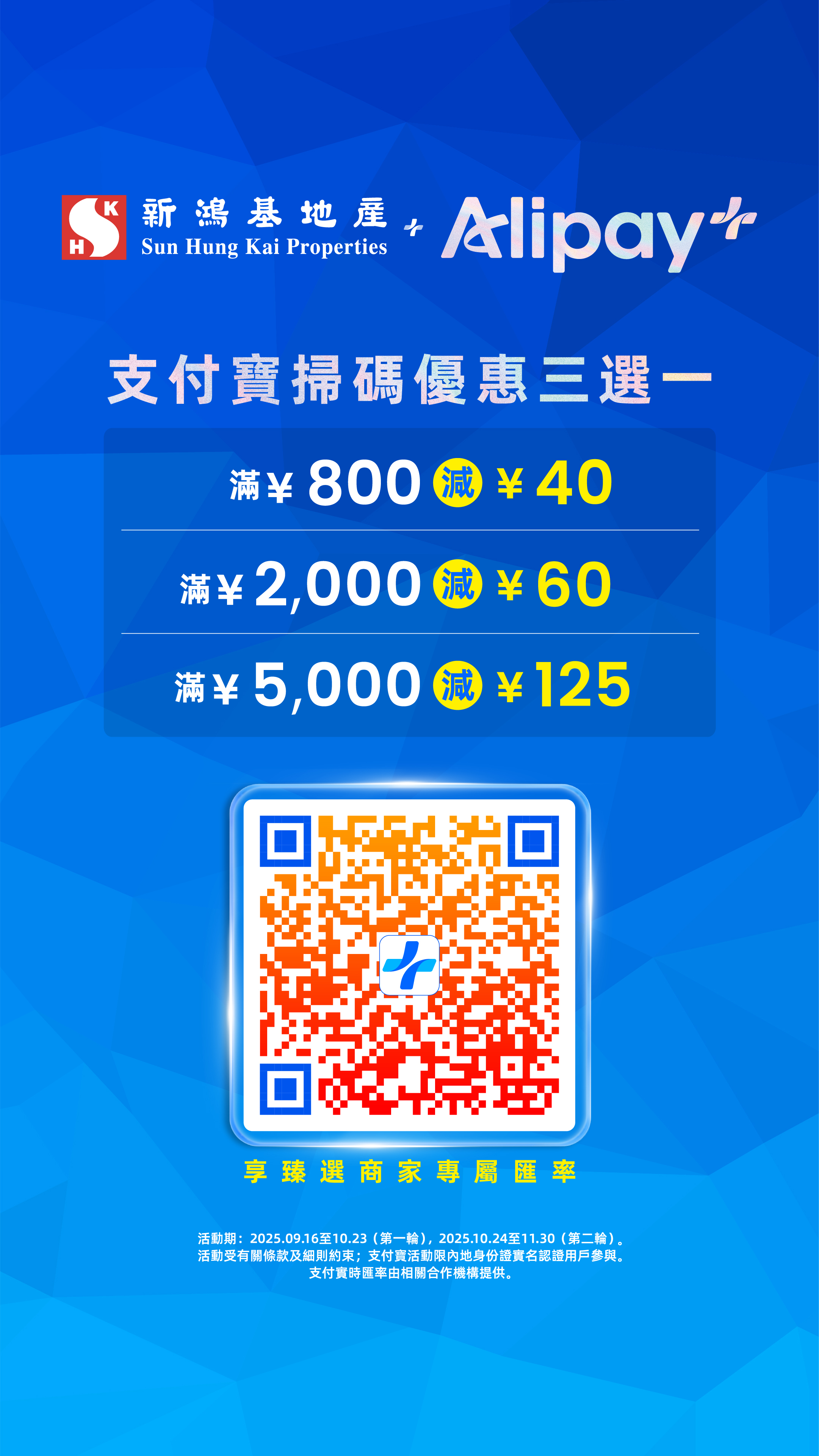 新地商場 x 內地支付寶 掃碼立減優惠三選一