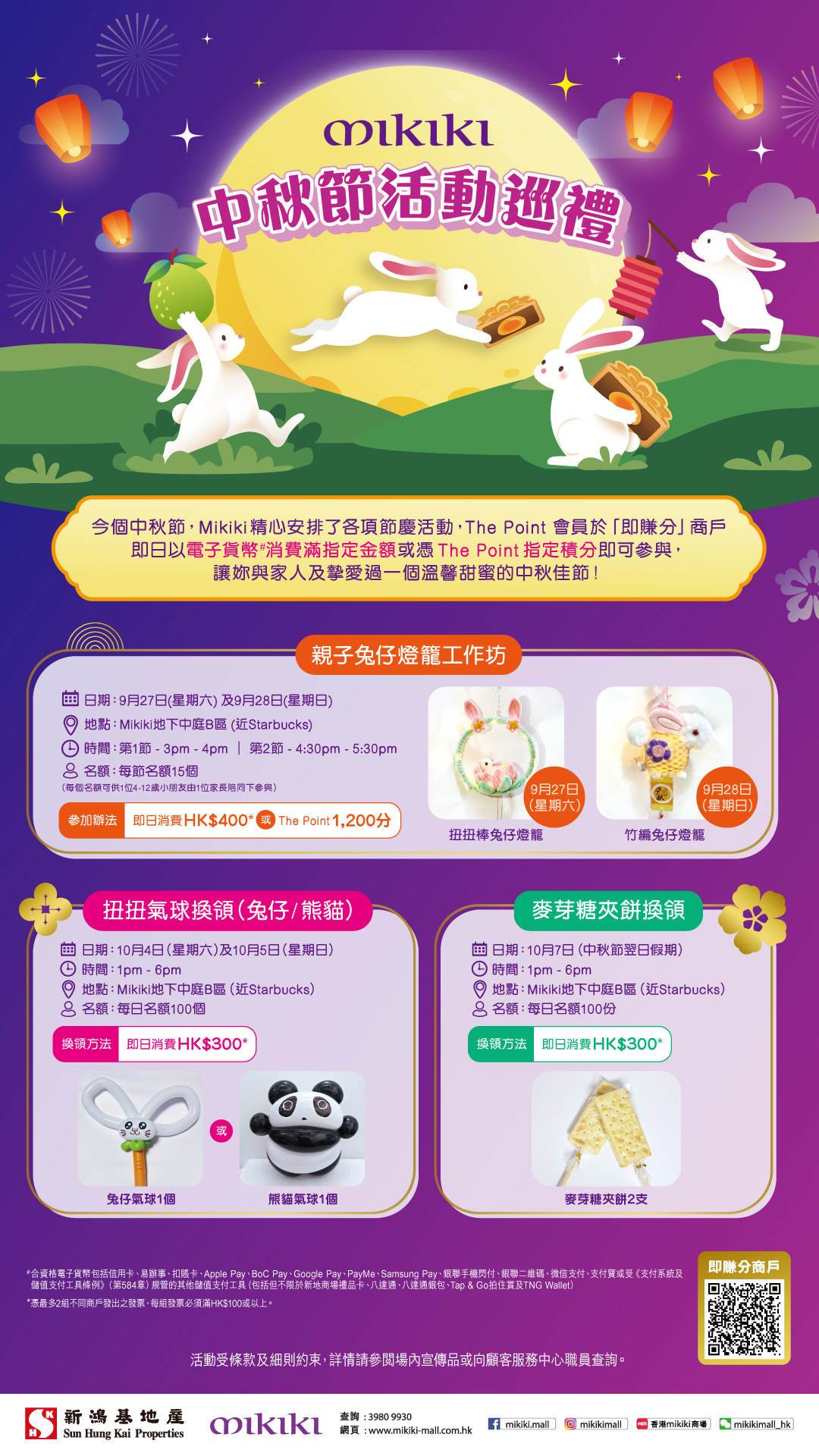 今個中秋節,Mikiki精心安排了各項節慶活動,The Point會員於「即賺分」商戶即日以電子貨幣消費滿指定金額或憑The Point指定積分即可參與,讓你與家人及摯愛過一個溫馨甜蜜的中秋佳節!