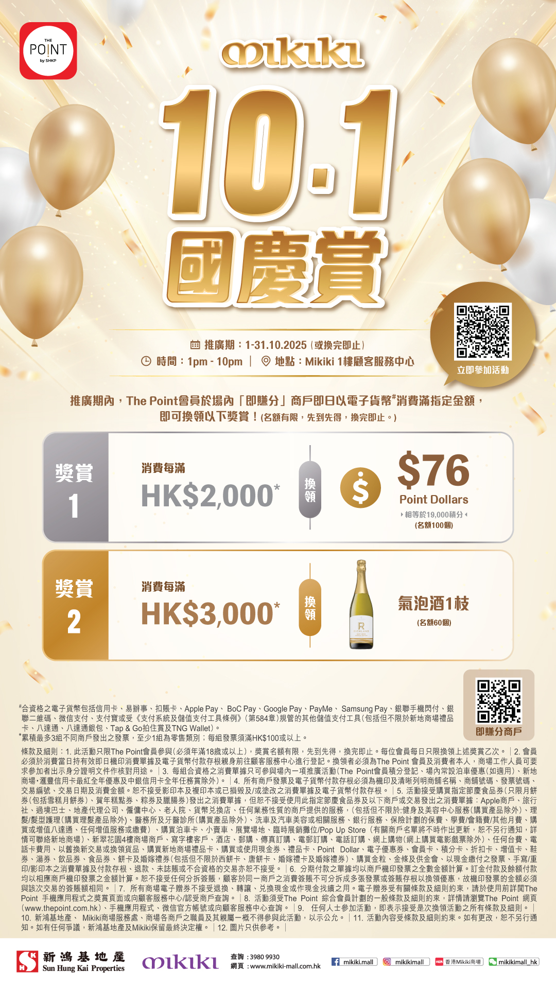 於10月1日至31日期間,Mikiki特別推出「10.1國慶賞」換領活動,The Point會員於場內「即賺分」商戶即日以電子貨幣消費滿指定金額,即可換領以下豐富獎賞。(名額有限,先到先得,換完即止。)