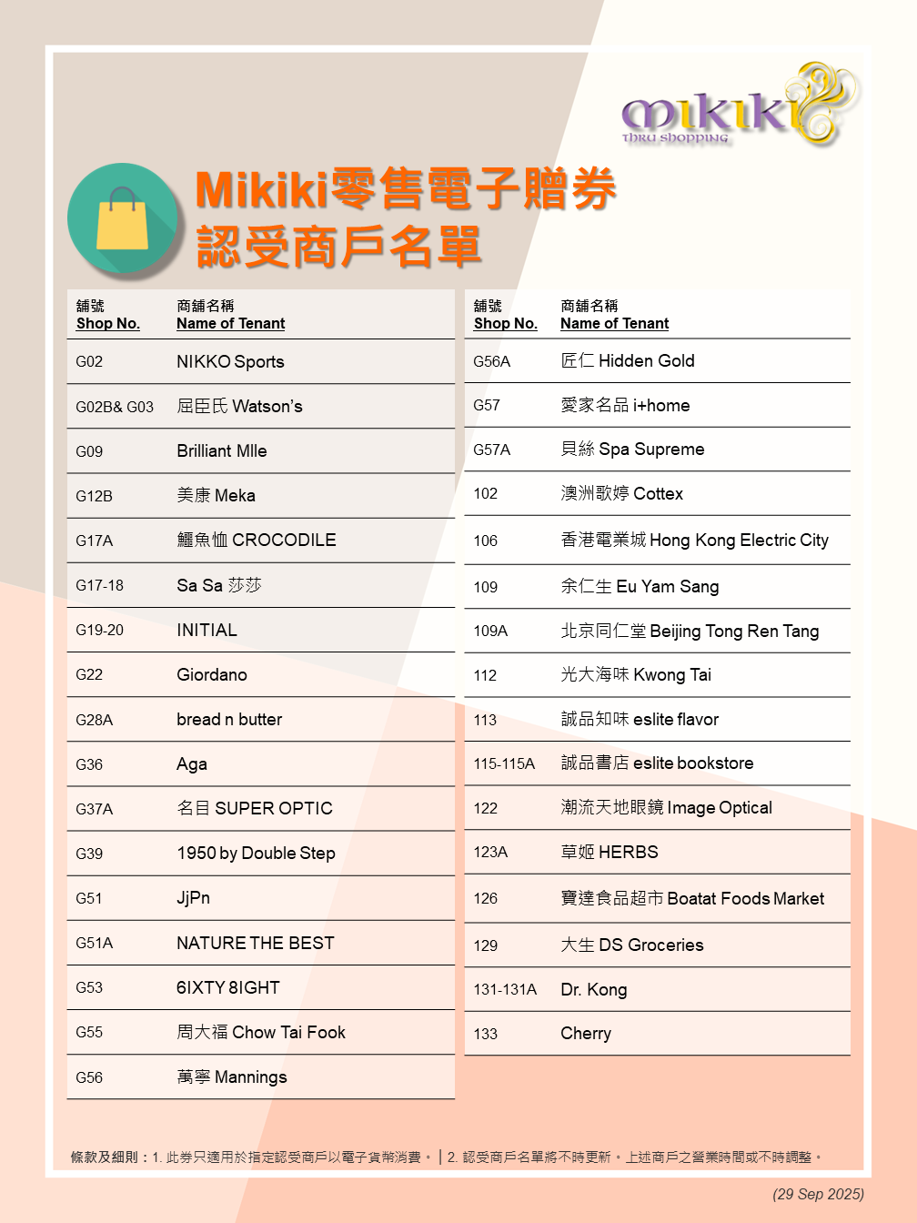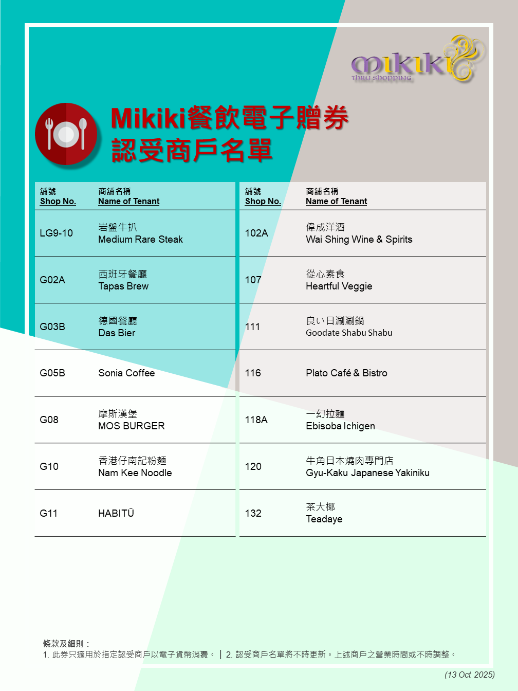 有關認受商戶名單將不時更新,詳情請向顧客服務中心查詢。